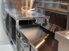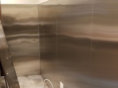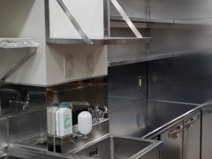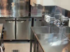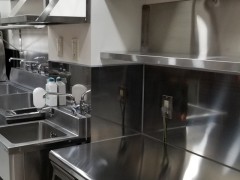 飲食店の厨房では、壁面にステンレスを貼る工事(ステンレス貼り施工)が重要です。油汚れや水はねが発生しやすい厨房では、清掃のしやすさ・耐久性・衛生面を考えた施工が不可欠です。武蔵屋製作所は、自社にステンレス板金工場を完備しているため、短納期・低コストで高品質なステンレス貼り工事を提供いたします。