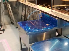 一部の店舗では、機器の上部の見える部分だけにステンレスを貼る施工がされています。しかし、これでは汚れやすい足元部分が未対策となり、清掃の手間が増えるだけでなく、衛生管理上も不十分です。